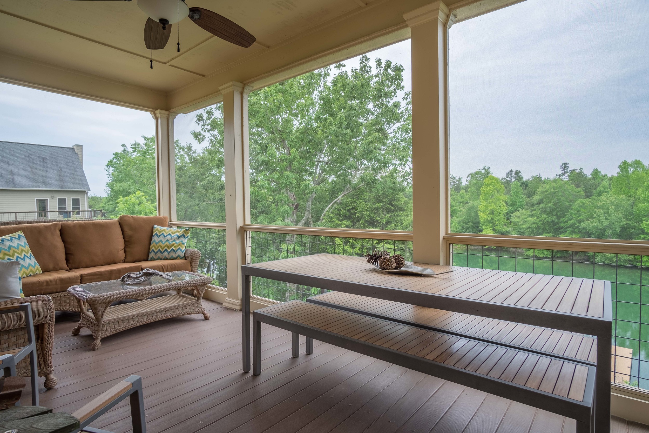 Lakeside has wonderful covered porches overlooking the lake. The upper porch is screened.
