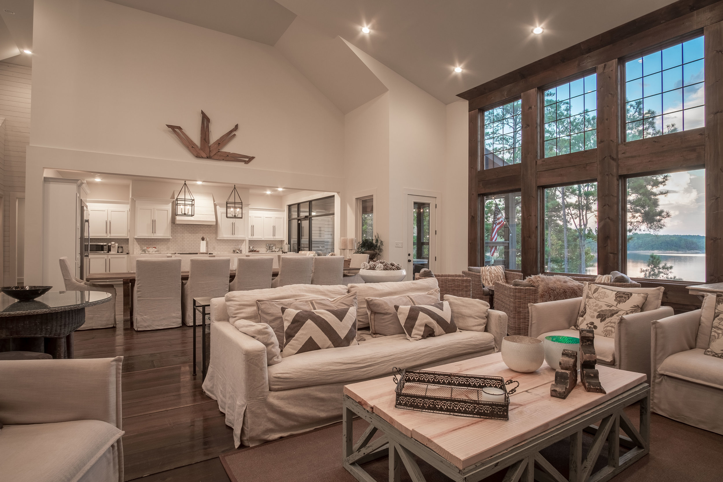 A brand new product by Mullen Design! Refined in every way, this home commands your attention the second you walk into the massive great room with 21 foot ceilings! You will be hard pressed to find a home with as much class, elegance, and style. Truly sophisticated with a rustic flair. Pine flooring gives the entire main level the lakehouse feel. The owner contracted Phillip Humphries, a local builder to construct this home to the specific design characteristics of the plan designer. The kitchen opens up into the large living area. Counters are Honed Alabama white. Commercial doors and glass panels give the home such a modern feel. Stainless appliances including a gas cooktop allow you to entertain with ease. Look at the huge lakeside screened porch which includes fireplace! Master bedroom is located on lakeside with incredible views. Master bath has ceramic shower, tub, and oversized walk in closet. Main level also has secondary living area overlooking the lake. A three car garage leads into the home. The stone wall foyer adds a bit of flair to the interior. Upper level has three guest rooms and two baths. Lower level has three guest rooms, recreation area, and two car garage. Floors are stained concrete. On the lakeside, you have just enough green space for outdoor activities while keeping with the property's low maintenance demeanor. Excavation and retaining wall work performed by Money Pledger.The aluminum boat dock has swim pier, boat and PWC lifts, and a nice shady area for relaxing. Located in Bluewater Pointe, one of the most exclusive communities on the entire lake.